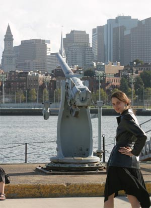 Дорога, вымощенная красным кирпичом, заканчивается возле огромных военных кораблей. Один из них называется "Конституция Соединенных Штатов". Все его тросы и другие канаты (Джейсон не сильна в морских терминах) выкрашены в черный цвет, что создает очень интересный графический эффект. Эффект очень понравился Джейсону, зато Юстасу настолько не понравился, что тот категорически отказался сфотографировать судно "Конституция Соединенных Штатов". Поэтому фотографии по этой ссылке нет. Зато мы посмотрели более современный стальной корабль, который использовали в какую-то мировую войну. Мы немного постреляли из пушек, посбрасывали торпеды и глубинные бомбы (я подозреваю, что это была вторая мировая война), и пошли изучать общественный транспорт Бостона.